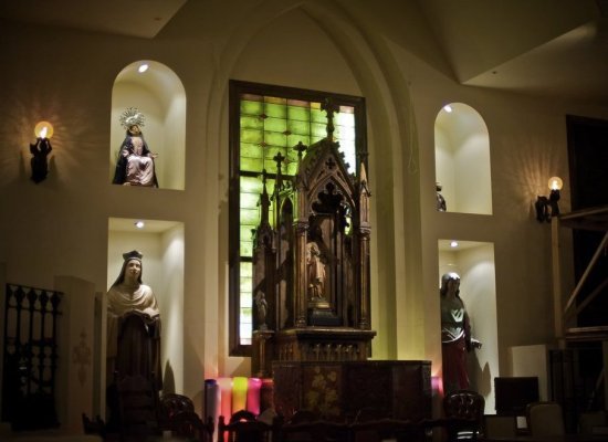 Stained glass windows, Virgin Mary statues and paintings of Jesus Christ fill this irreverent Tokyo spot inspired by the Catholic Church. Diners listen to organ music while eating izakaya (Japanese small plates) and ordering off a coffin-shaped beverage list.